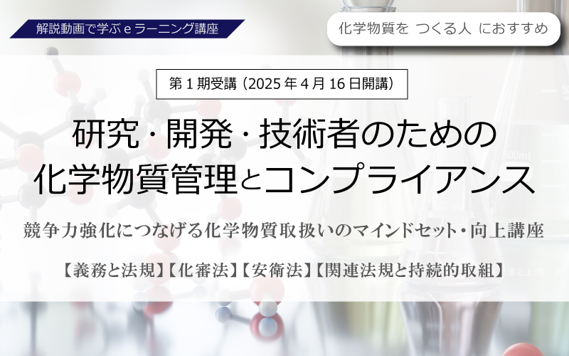 第1期受講(2025年4月16日開講)≪解説動画で学ぶeラーニング講座≫研究・開発・技術者のための化学物質管理とコンプライアンス