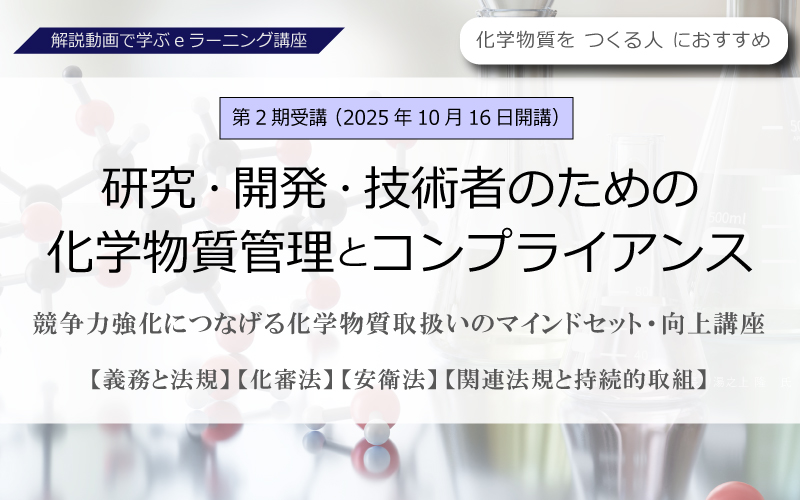 第2期受講(2025年10月16日開講)≪解説動画で学ぶeラーニング講座≫研究・開発・技術者のための化学物質管理とコンプライアンス