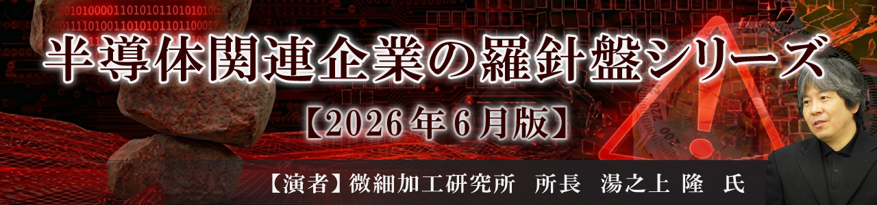 | 会場受講について ・定員になり次第受付終了とさせていただきますので、お早めにお申込みください。 ・講義中の会場でのパソコン使用はキーボードの打音などでご遠慮いただく場合がございます。 半導体関連企業の羅針盤シリーズ 【2026年6月版】AIブームは崩壊寸前、その対策と羅針盤